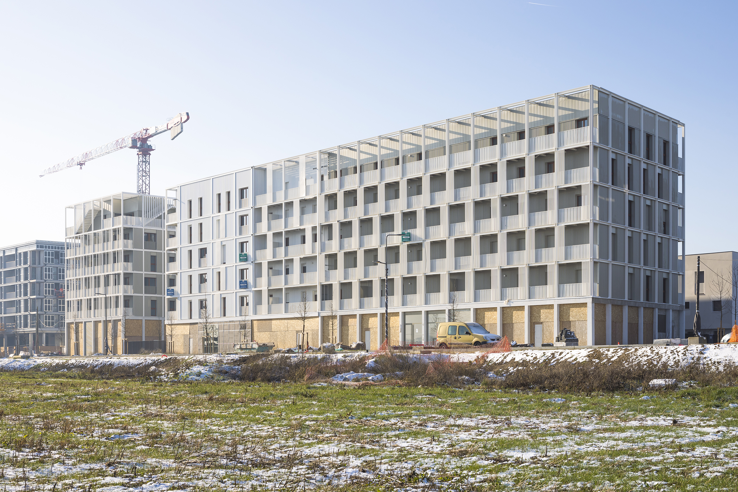 approche constructive rationnelle partagée : façades en ossature bois, infrastructures communes, matériaux déclinés de